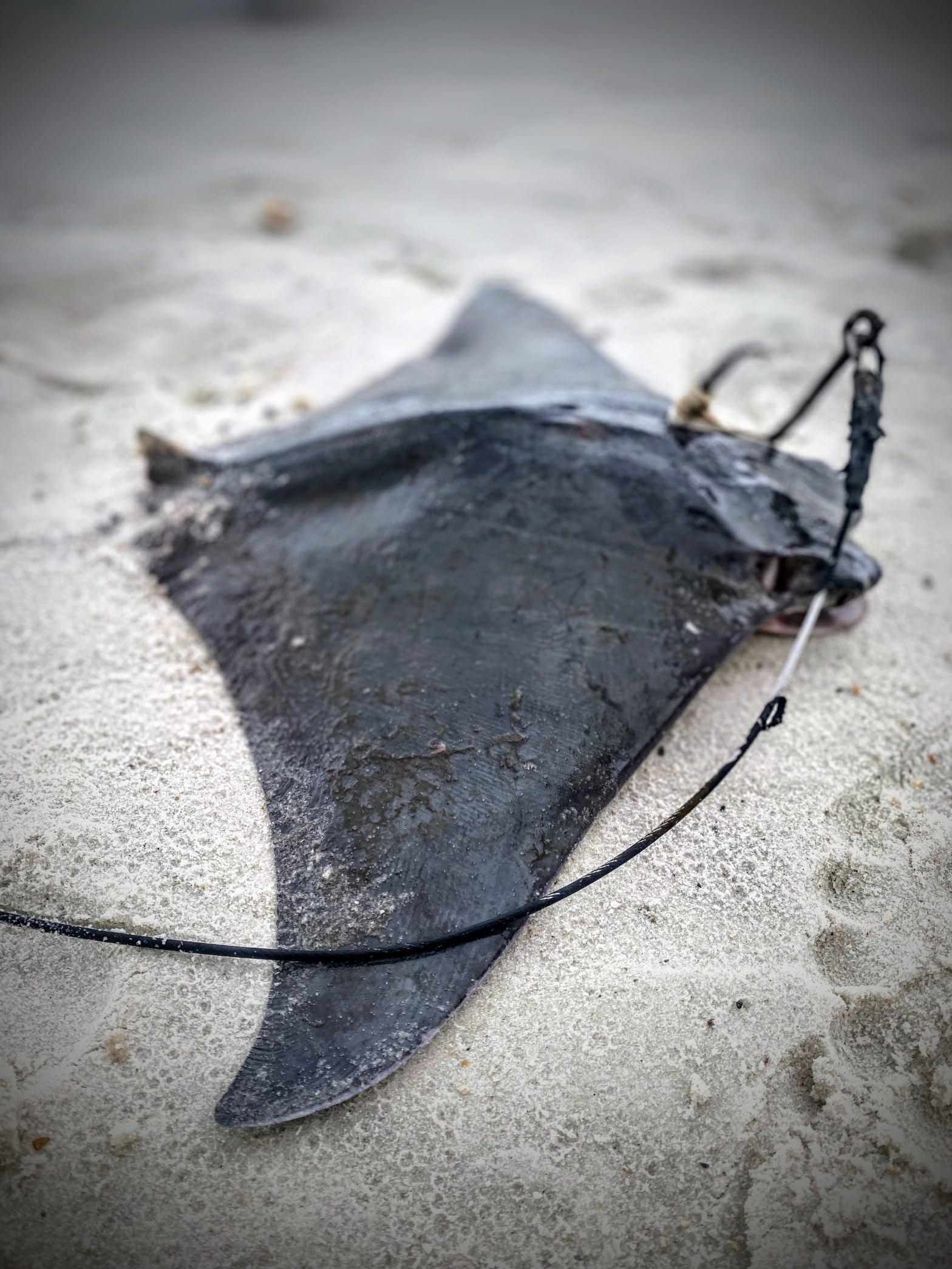 Since I was gutting fish before I could walk, you can bet I was interested in all the shark-catching details. From where they got the bait – $20 for two stingrays at the store or skewering them live with a small trident affixed to a rope – to the shark’s information – hammerheads and tiger sharks are protected, whereas bull sharks and nurse sharks aren’t, and it’s those that are eaten.