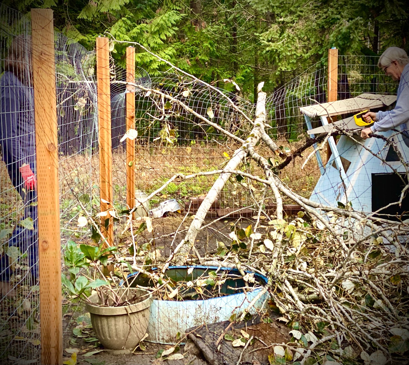 The top ten feet of a 30-foot-tall Alder broke and hit the duck pen last night. Thankfully, no one was injured, but the wire fencing, netting, and my favorite pool were damaged.
