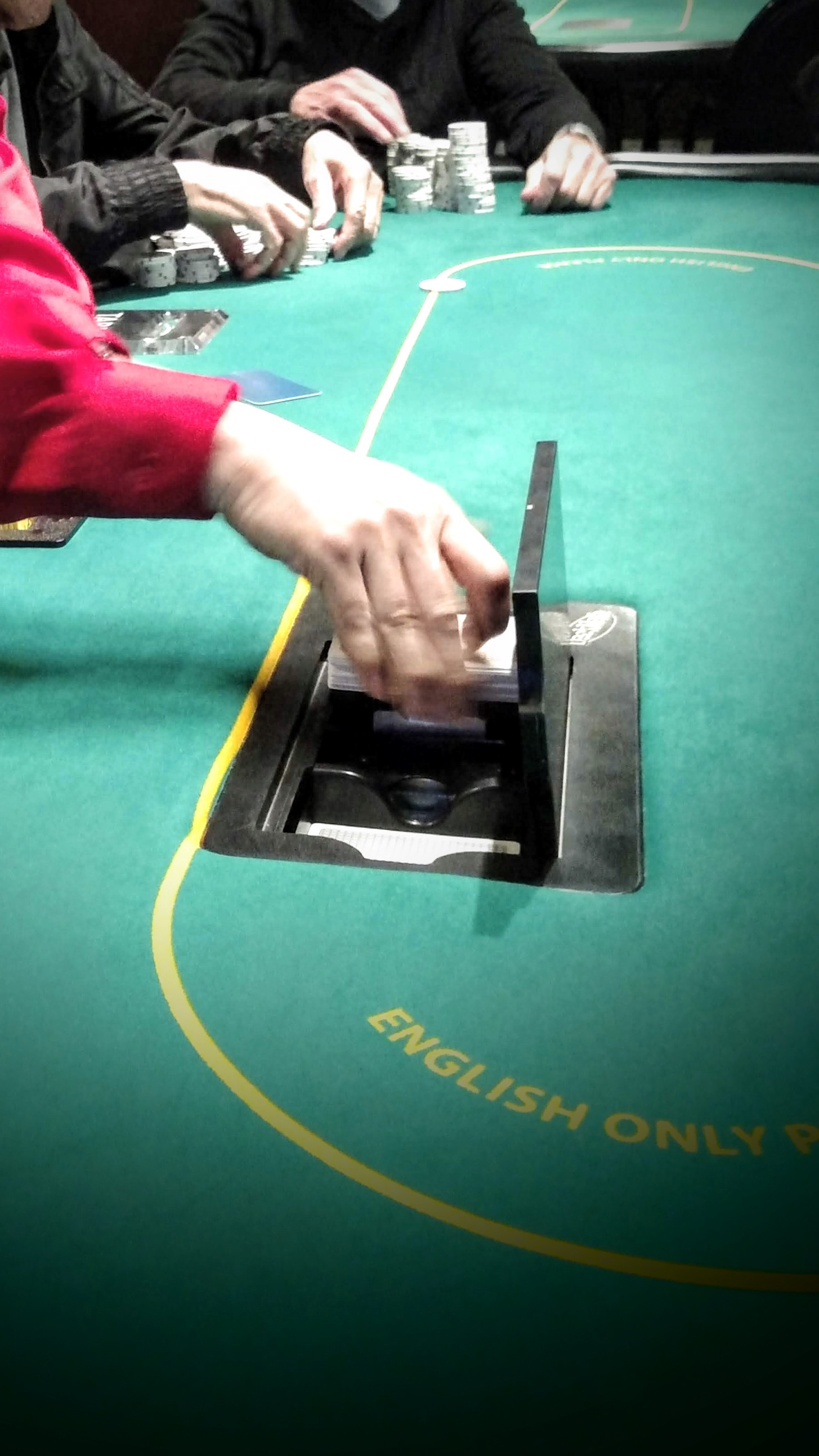For a poker dealer, there are many rules, some make sense and some don’t. Use one hand to cut the cards, leaving the other slightly upright. Why upright? Some say it’s to present to the table and to the cameras there’s nothing in your hand. Oh yeah, you’re on camera too!