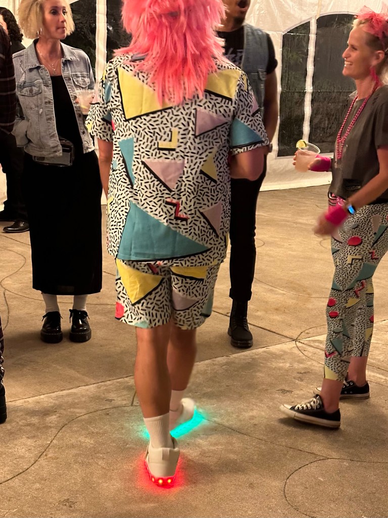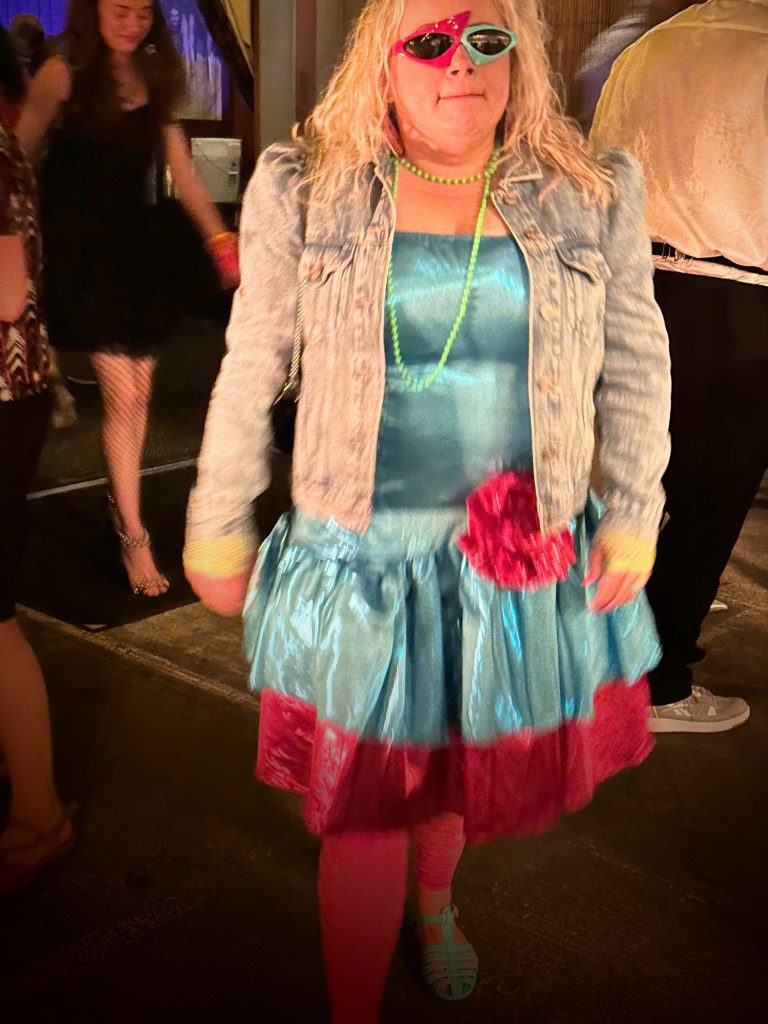 I’m rocking a side ponytail, hot pink, blue, and purple eye shadow, and a short, strapless iridescent purple dress. This 80s prom concert will be made better because of us!