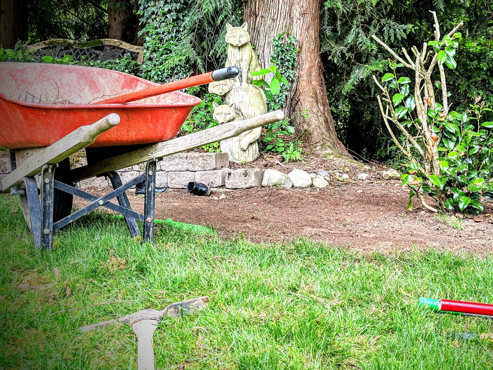 Shaping the Space: Inspired by Evelyn’s suggestion, I outlined a spot in front of the rhododendrons and camellias using spray paint. Armed with a hoe, I uprooted tufts of grass. Embracing the tactile connection with the earth, I removed my Birkenstocks. Where I felt the dirt shift beneath my feet, showed me where to level with the rake.