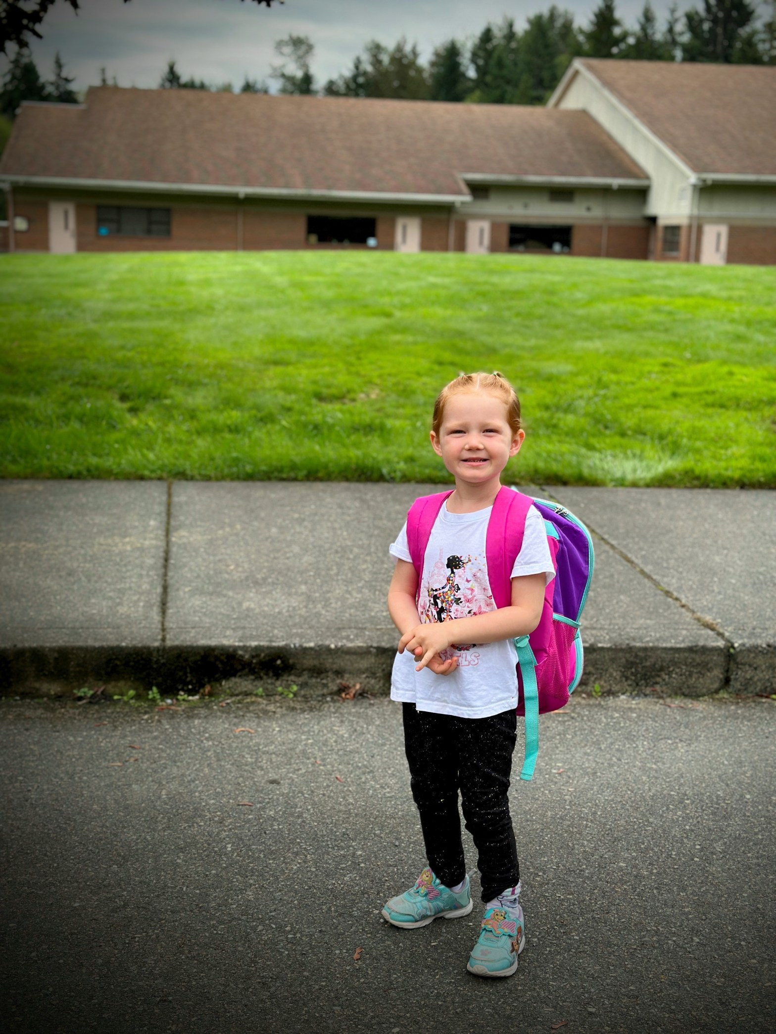 Yes, I did say day two of school. Which means, today was day one. After we got home, in Evelyn’s backpack we found a piece of paper with three faces, one smiling, one frowning, and one with a curvy, unsure look. She told us she had to pick one to color in. The sad face was partially colored with an ‘x’ through it, and fully filled in was the happy face. I asked her why, “Well, I was looking up and drawing. Then my teacher showed me how to do an x, and I was happy so I colored that one.”