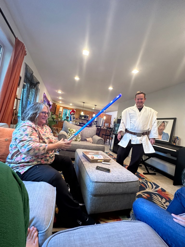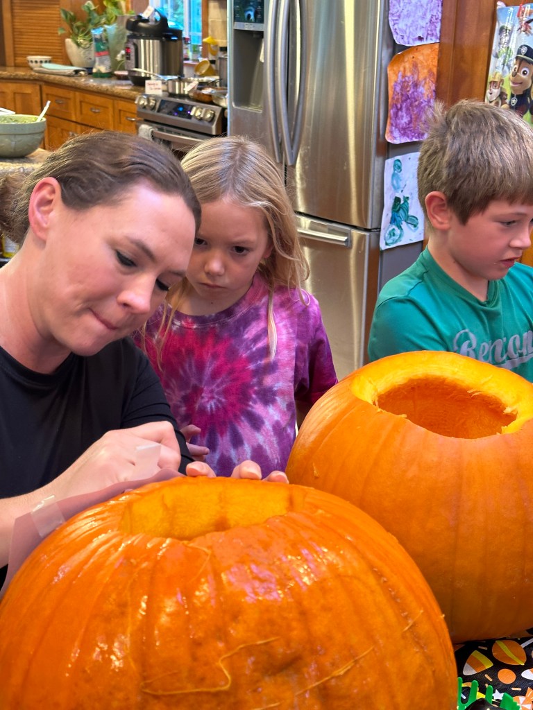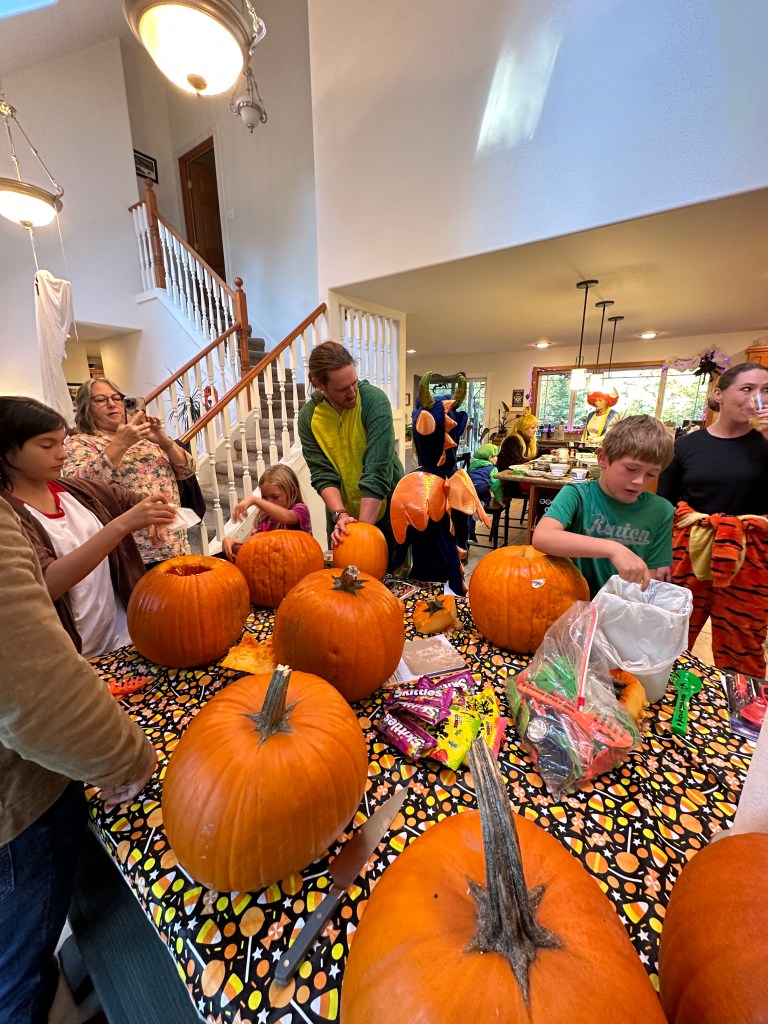 Pre-party grocery shoppingBest friendsThe concentration.Evelyn and Papa.Carved pumpkins included a peace sign (mine), a bat, a gnome, a cat and moon,“I want to be a light up ghost!” So Mom made it for him.Testing out the authentic light saber.Only a little mess to clean up.
