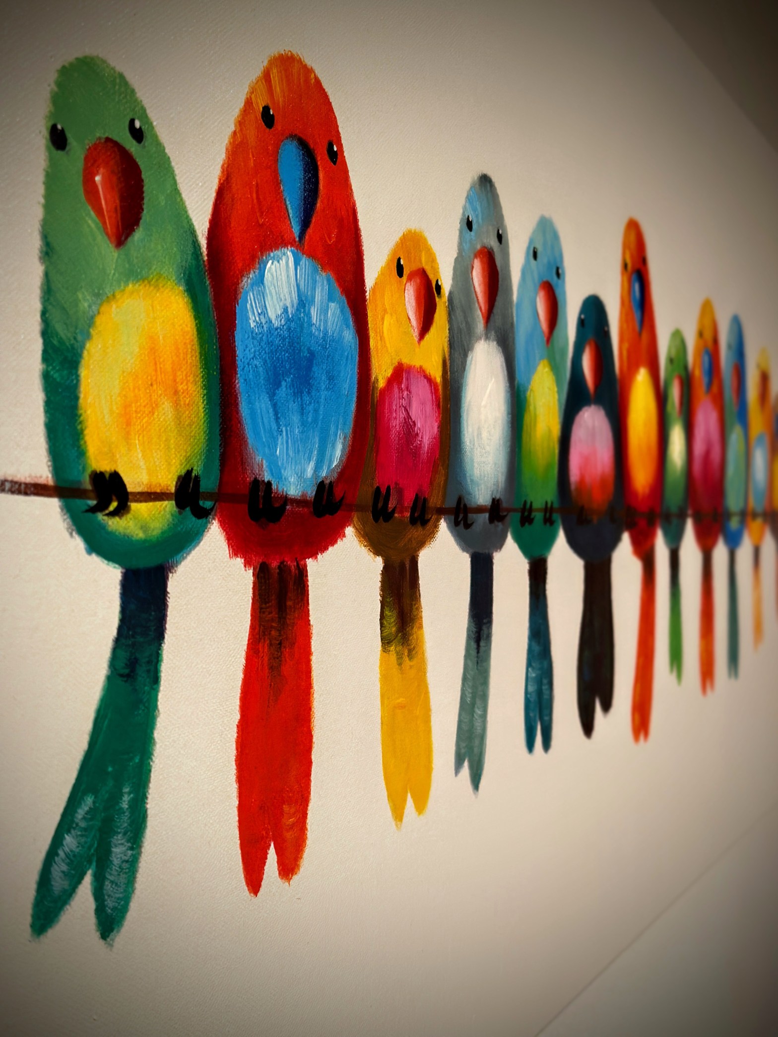 I’m so used to the colorful birds on a wire print in my living room that I hardly notice it anymore. I remember drooling over it at a Boba tea restaurant in the University District in Seattle and snapping a picture to recall later. It wasn’t until years later, with a 15-foot white wall to decorate, that the silly beady-eyed birds came to mind. Now, seeing their 24 black-with-white-specked eyes, heads slightly tilted to the left and right, I’m grateful those cuties are keeping a watchful eye over me.