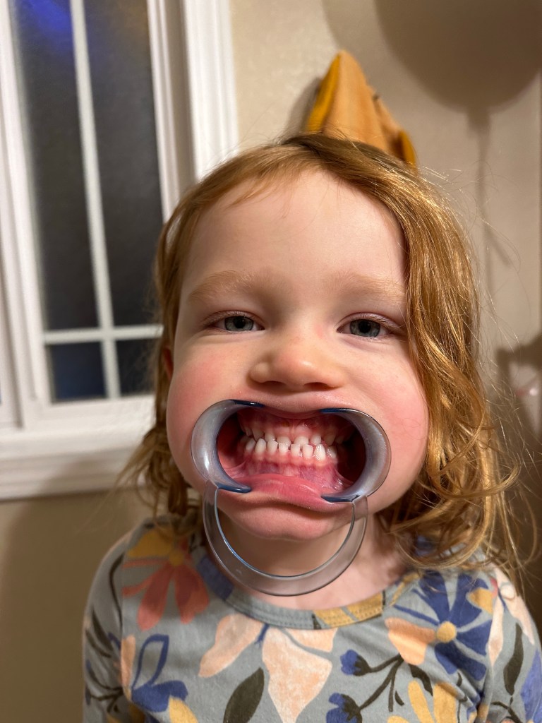At teeth brushing time, Evelyn does pretty well, but there are those deep-in-the-back molars I worry about the bristles missing. However when I saw her playing with the mouthpiece from the board game “Watch Your Mouth” and the way it permanently propped her chops in full display I knew I had to try it out in our evening routine. As you can see here, it did not disappoint!