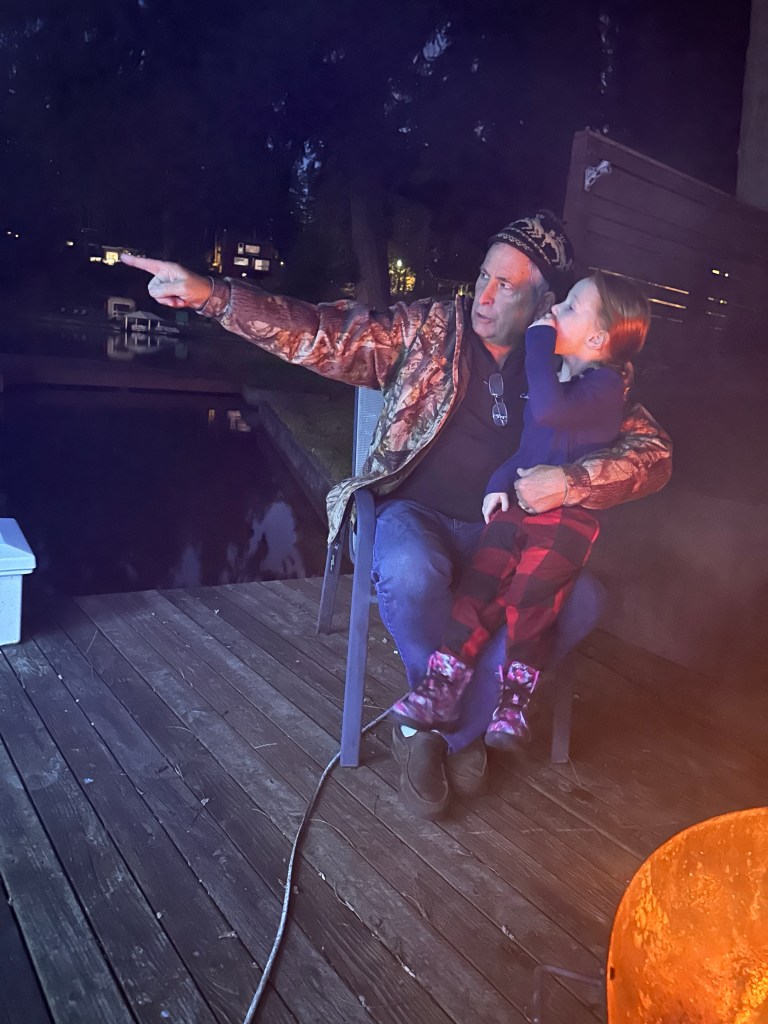 “That’s him! See the blue lights?” My dad points across the large lake at the lit-up boat in motion, bringing the binoculars to his eyes and then to Evelyn’s. Although it’s too far away to see the big red-suited guy, one can anticipate and dream.