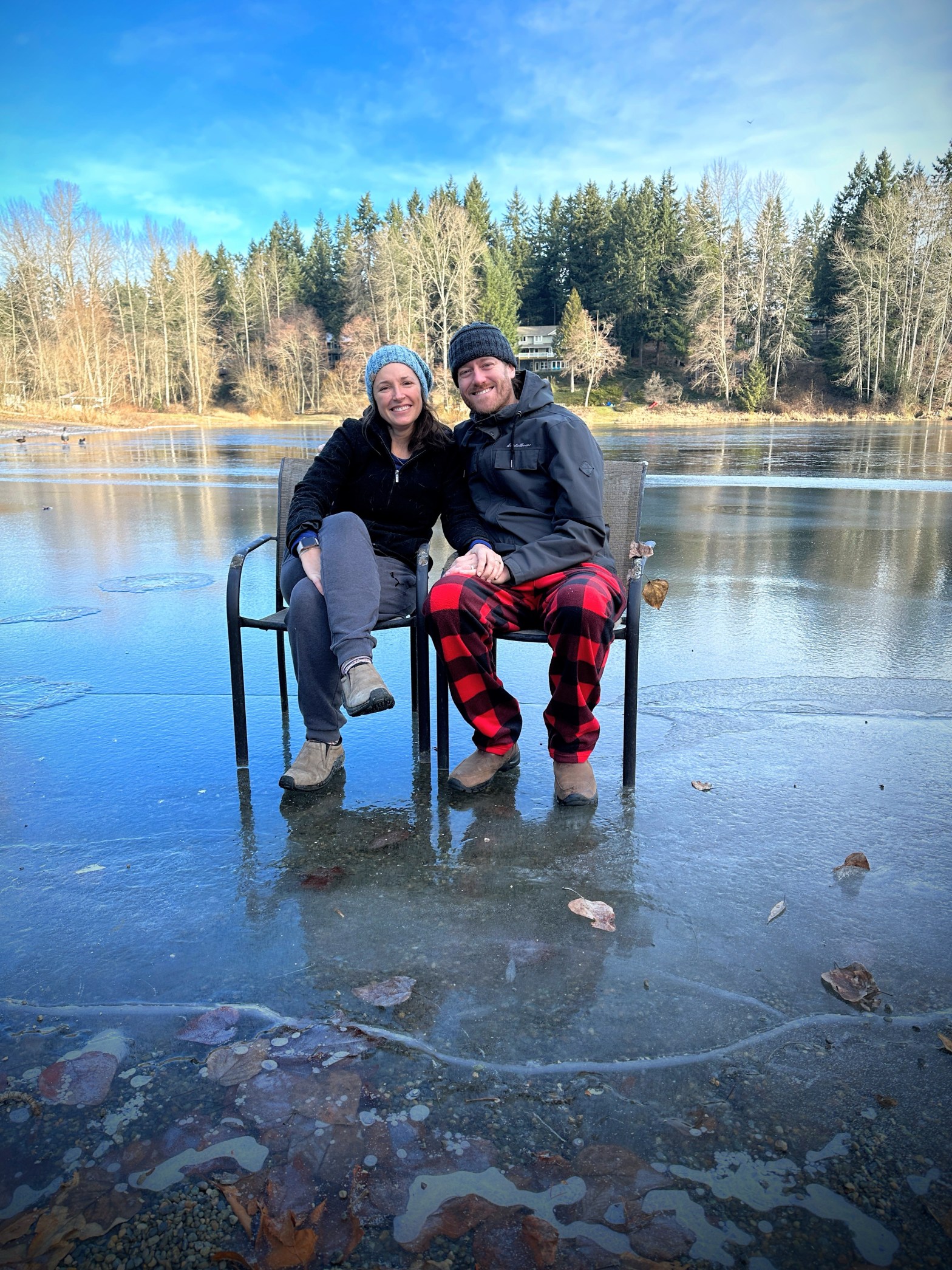 From a football field away, it was hard to tell what was going on with the lake at the end on our property. The ongoing freezing temperatures had to have affected it, but it wasn’t until we made the trek to see today that we realized just how frozen it was. Besides our ability to walk on it and sit in chairs, I thoroughly enjoyed seeing the two heavy, honking snow geese on it. One sat waddling in an open water spot while the other stood nearby, as if walking on water.