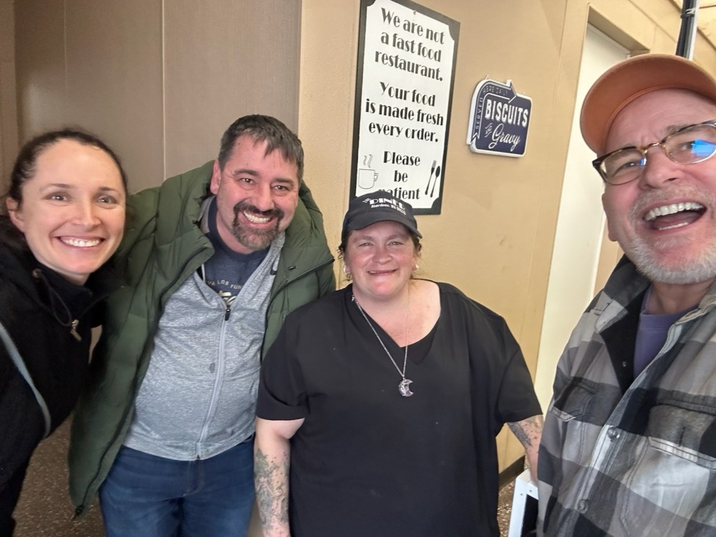 The highlight of the day was Kizzy, the owner of The Diner, personally crafting gravy from scratch for our biscuits, sharing stories of her positive encounter with the health department inspector, discussing the soaring egg prices for restaurant owners due to a cage-free law that took effect on January 1st, and explaining the pile of clothes in the corner next to our table.