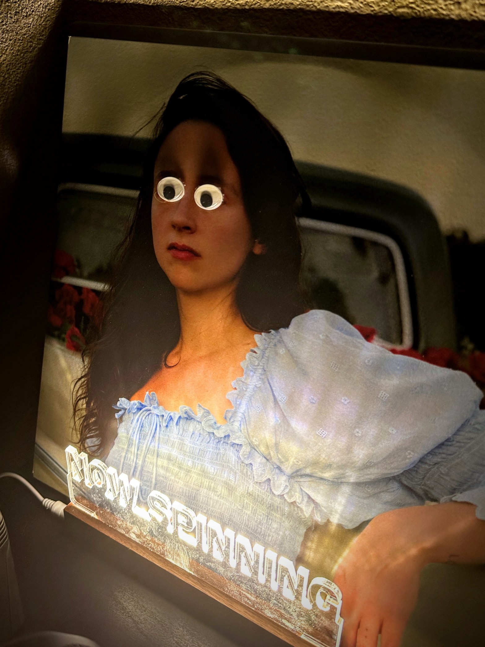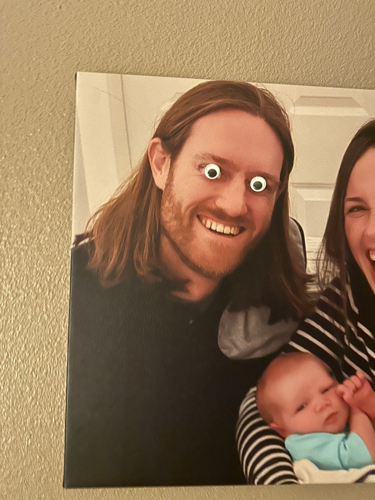 I’m mad at myself for not being fun. Which isn’t true at all! I taped googly eyes all over the bedroom for Dave to find. Googly eyes on top of Waxahatchee’s face on her vinyl record, googly eyes on Dave’s face in a picture of him holding Evelyn, and googly eyes on the outside of his eye mask.