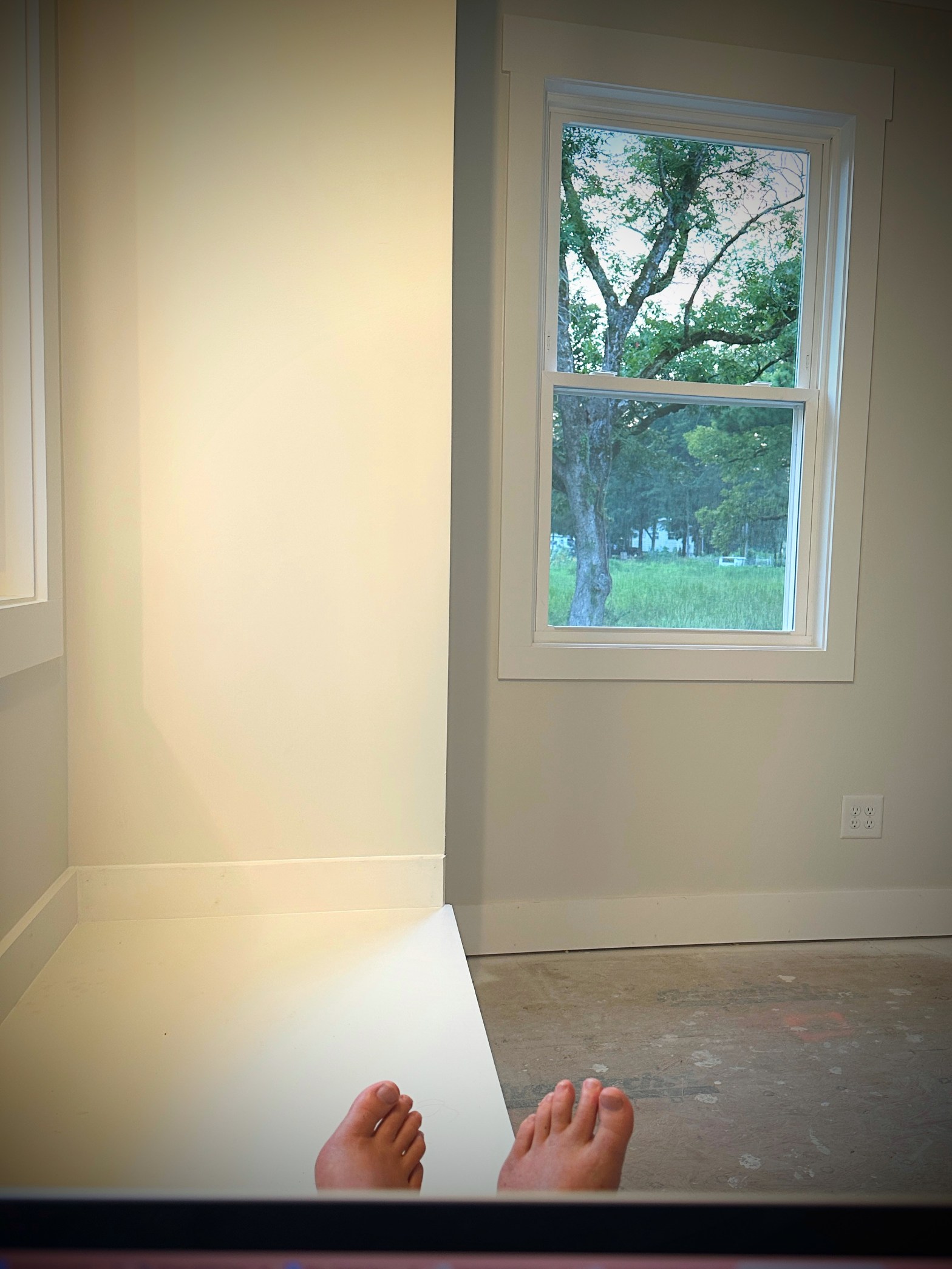 Until today, with freshly wired internet, I took a 6pm PST/9pm EST session on the bench window seat of my carpetless future bedroom. With my back against the wall, legs tucked into my belly, laptop set atop my knees, I felt the hardness of a still-to-be-cushioned board and swooned at the swallows flying limb to limb and the giant oak tree whose branches created a firework of activity. I felt peace. Then, in the garage, in a just-moved box, I found a soft and plush blue and white pillow from my previous bed and brought it in as a makeshift cushion.
