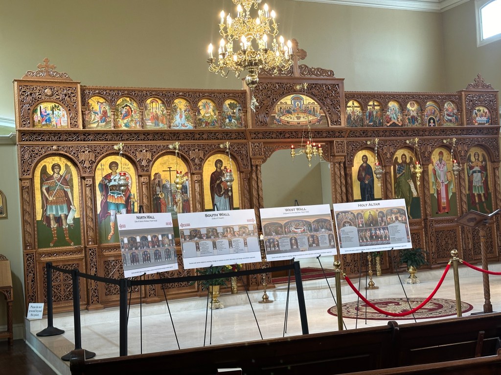 As for the Greek Church, they hosted an event with food and dancing outside their building. After Greek fries, a gyro, and a sausage wrapped in pita Evelyn and I joined in with a group dancers to hold hands, and leg kick around the periphery of the picnic tabled center. After, we were allowed to scope the building’s interior with its incredible stain glass depiction of an angel and its incredible architecture.