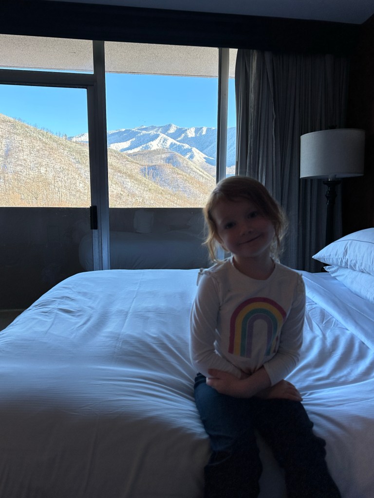 We’re about an hour away from Gatlinburg now, and for the first time, a snowy, jagged ridge broke through the oaks and cedars, stealing the spotlight. Its gray-and-white peaks hit me with the kind of awe that feels like home. My Cascade Mountain heart is thrilled to see these Smoky Mountain beauties.