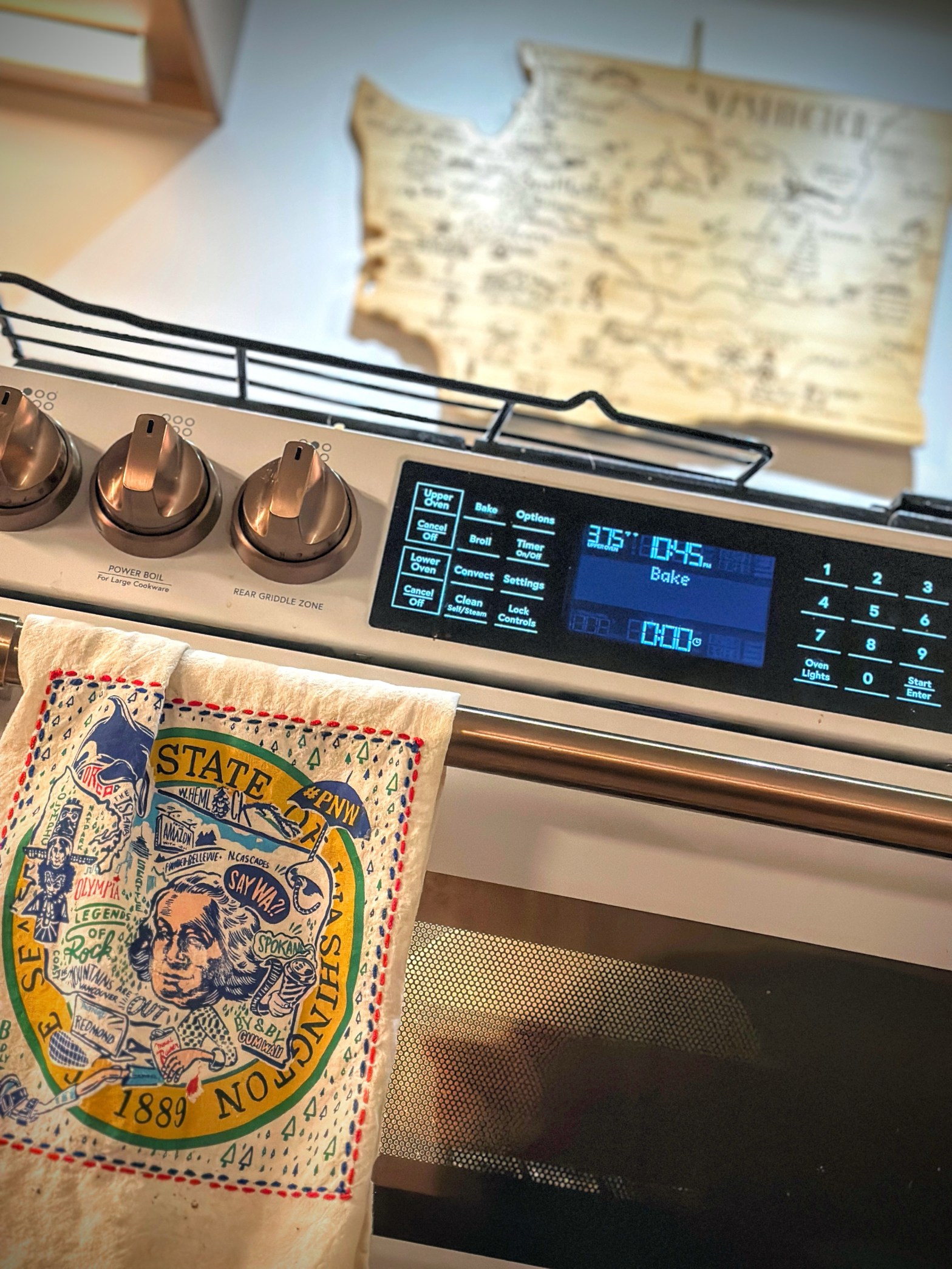 I just took a picture for you—it’ll be tonight’s post photo. I couldn’t help but show off my Washington love: hand towel, cutting board, and the shadowy figure of the bread in the background. I gave it another five minutes in the oven after a bit of dough clung to the thermometer tip. It should be good now.