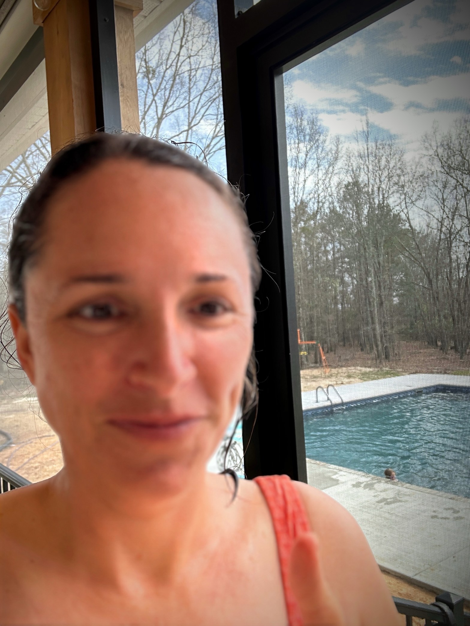 So, in front of Emma, Evelyn, and Dave, I jumped. The cold was a shock, and I scrambled toward the side—not in a do-or-die way, but in a whoa, that’s colder than expected way. The kind of way that says, You could swim in this daily for exercise, you know. People do cold plunges all the time. Maybe it could be a radical shift, a way to fuel myself with pure invigoration for the day.