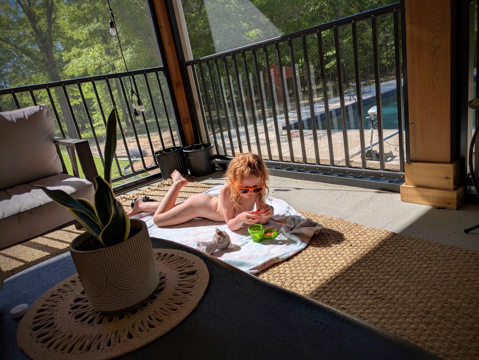 I’m in the rocking chair on the front porch. Evelyn and Dave are lying in the stand hammock, playing I Spy. Every third pick is mine. I’ve been ebbing and flowing like this all day: one step in hosing down the chicken coop, the next dodging squirt gun blasts, or catching a football with Evelyn and Dave.