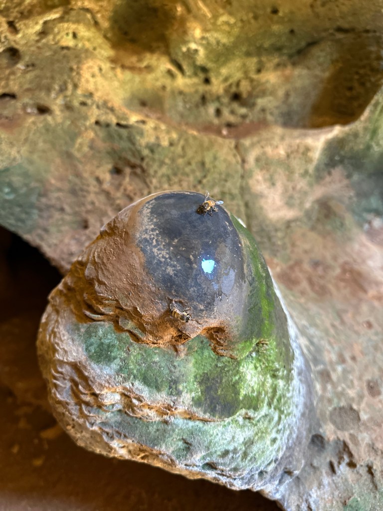 Dave’s sudden about-face caused the light from his phone to flash directly into my eyes. He took a step toward me and said, “There’s bats in there.” Not knowing how many bats or how big they were sent my inner Tinkerbells doing backflips midair. I retreated just as he had. A moment later, a single, small black zigzagger fluttered into view, and I returned to earth, realizing we’d only disturbed one or two — no bigger than an oversized butterfly.