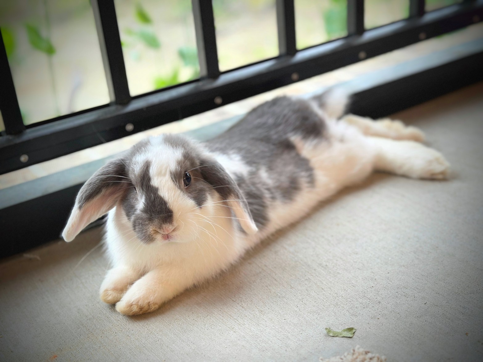 My love-colored glasses for this bunny are as powerful as the rolling thunderclaps outside. I’m in the screened-in part of our deck, watching him—chewing, licking the webs of his paws, kicking his hind legs out like he’s sunbathing sideways, and suddenly catching the zooms. All this, within an hour of impulsively buying him from Noah’s Ark Pets when looking for fish.