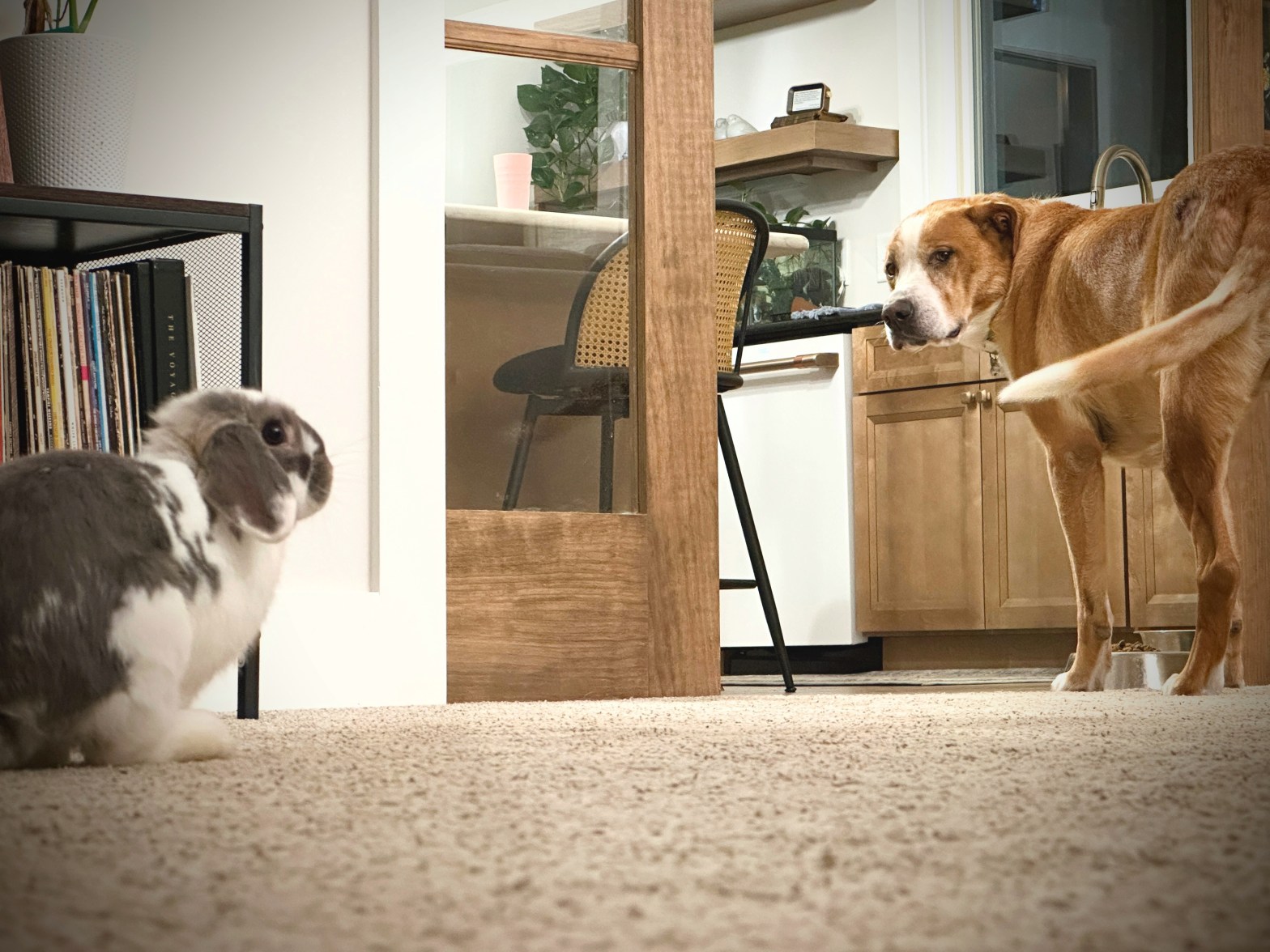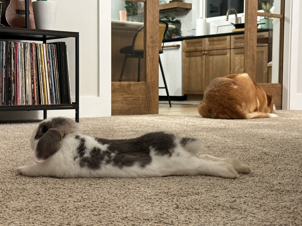 I’m lying on my stomach on the carpet, two feet away from Puffy, who’s also belly-down with his back feet kicked out. He got whoofed at by Archie, who has instantly gone from uninterested in his kibble to guarding it. My earlier worries about the dog bunny pet combo have cleared, and in it’s place is a curiosity at just how great of friends they’ll end up being.