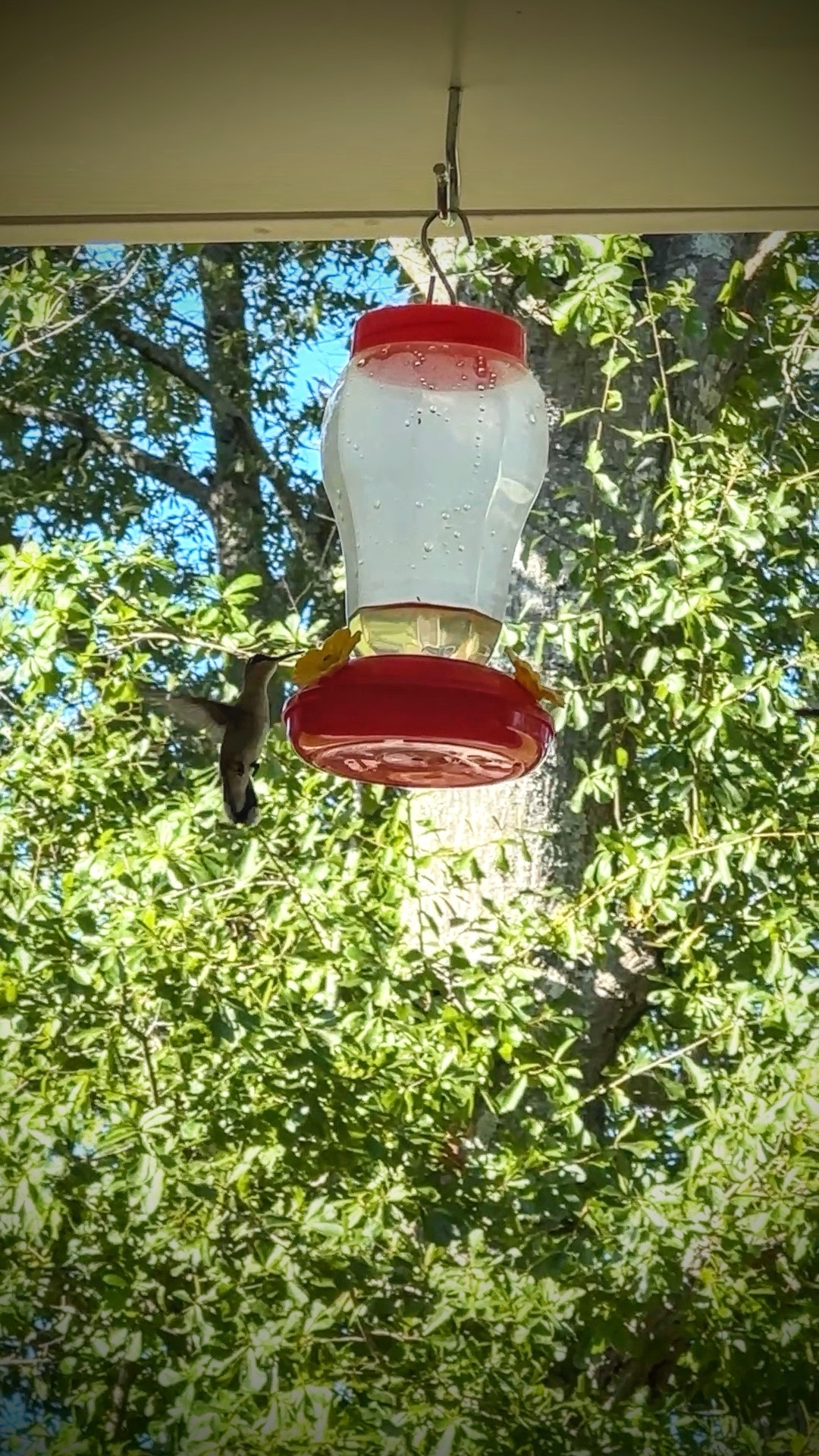 I think I’m up to seven hummingbirds now. It’s getting hard to count with the little buzzers flitting around. Two will swoop in like NASCAR drivers rounding a bend, then speed out. Then two more. Were those the first two again? Hard to tell. After I added two more feeders—bringing us to five—the fighting has eased. Last night I saw four hummingbirds peacefully spread out, calmly sipping their nighttime tea.