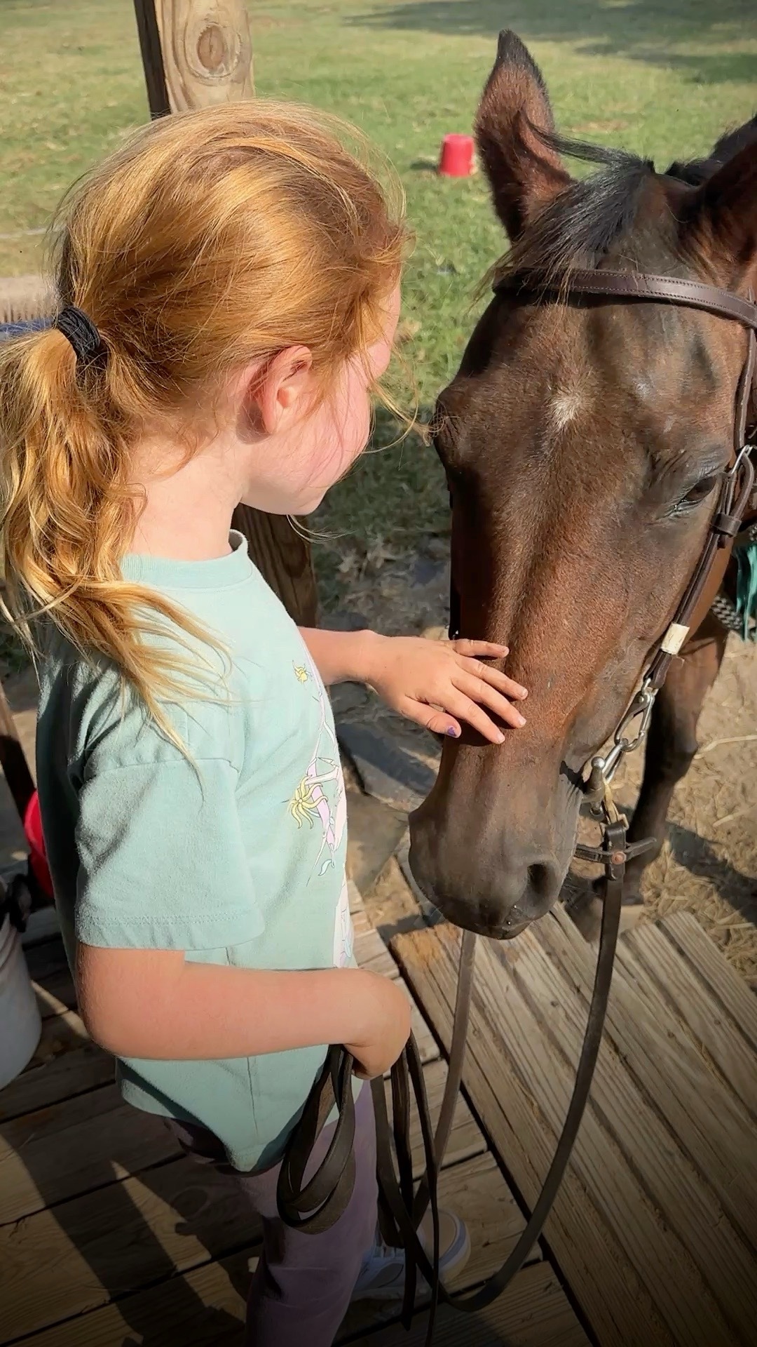 With nothing on the afternoon calendar, Evelyn pulled on long pants, grabbed her new Toothless toy, and off we went, nine minutes down the road. From start to finish, it was delightful. The teacher—a 16-year-old girl who could’ve been a horse whisperer—made us feel completely comfortable. She guided us through brushing the horse, holding the rope, and even helped Evelyn pull herself up into the saddle. She explained how she’d worked with the horse to build its training and confidence, and it was impressive.