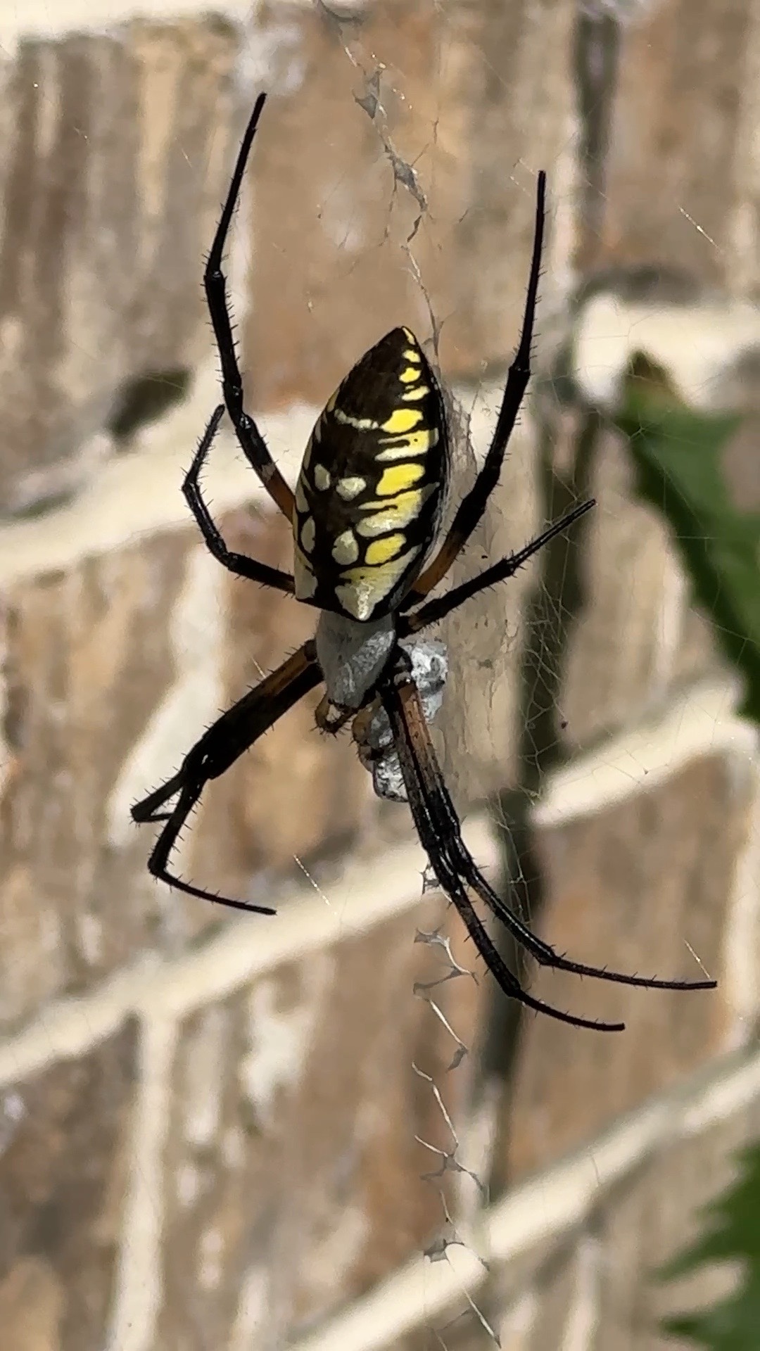 Meanwhile, our spider moved. Both Dave and I noticed separately, and when he asked if I knew where she’d gone, I didn’t. But later, standing outside, I spotted new webbing near the eave, and around the corner, there she was, tucked against the brick. I wonder why she moved. It’s not like she’s short on food—between the grasshoppers we toss her daily and whatever else she catches. Maybe the three-inch beauty is ready for moths or something new.