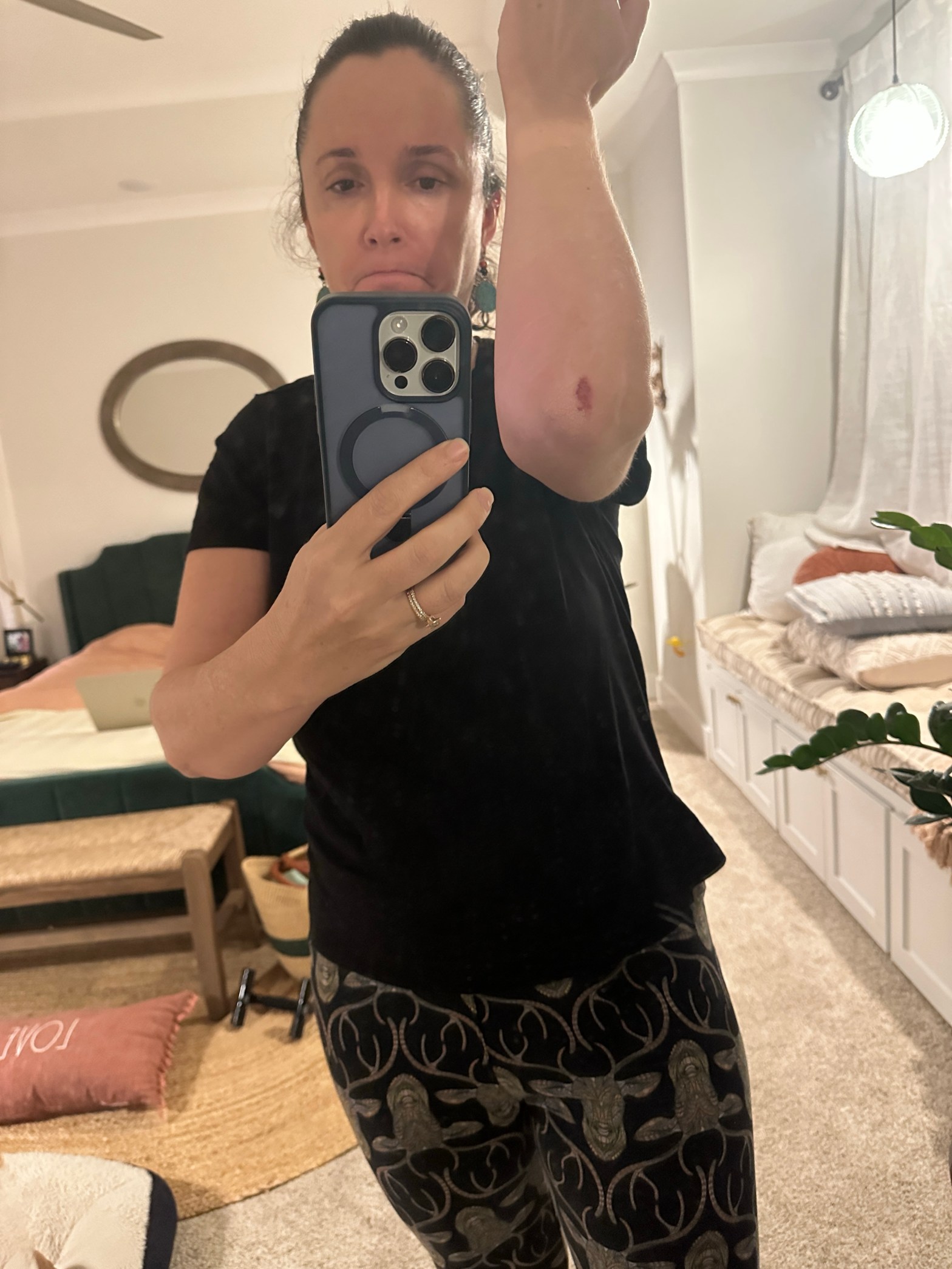 Strangely, it unfolded step by step: awareness of Evelyn first, then a desperate pulling backward against the fall, and finally a flattening of my body so she could land on me, so we were two horizontal pieces of plywood. I ended in full Superman arms, with nothing worse than a burning elbow (now scabbed) and a sore knee. Evelyn walked away with a nickel-sized bruise on her knee. That was it.