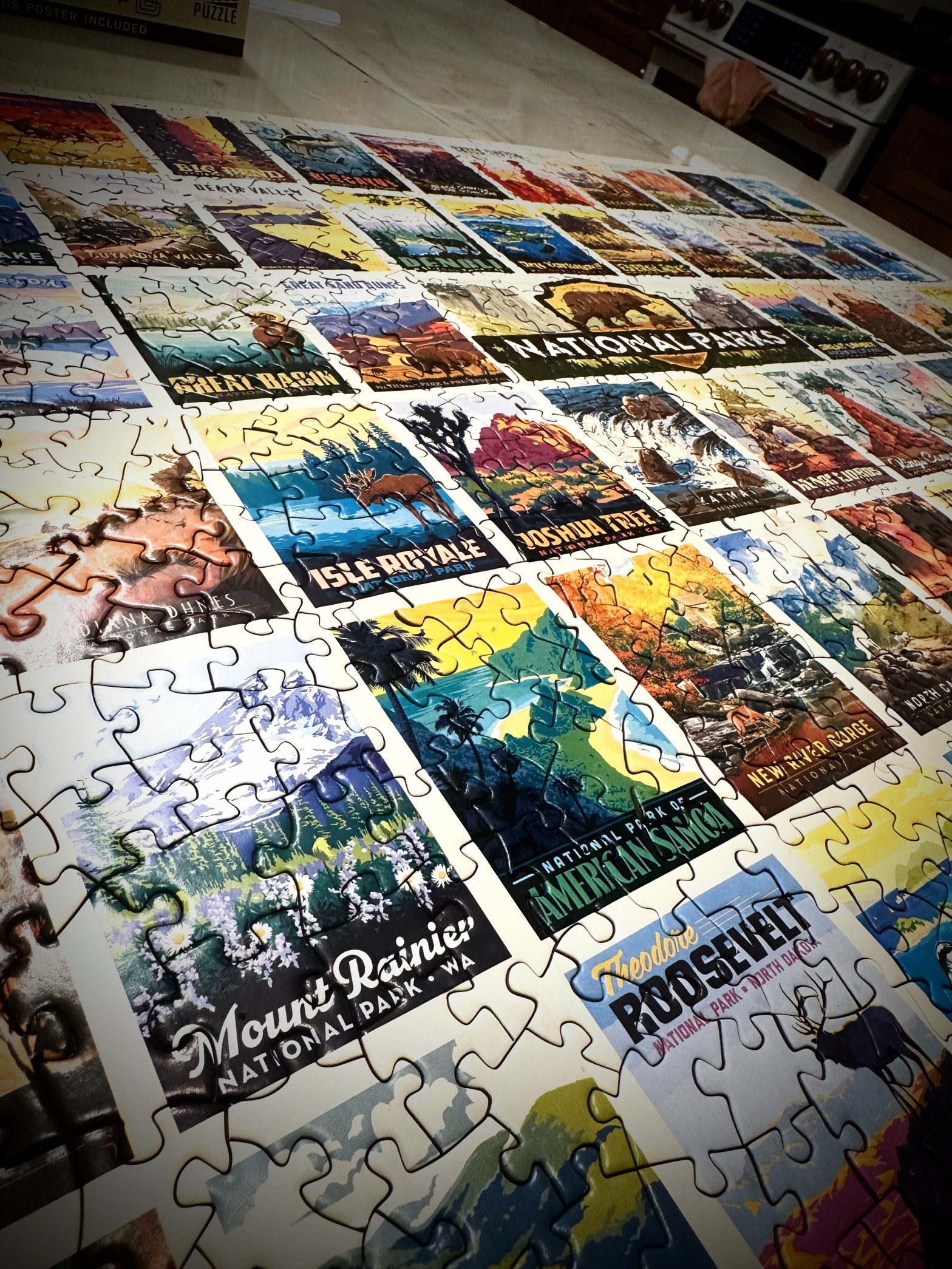 Today we finished a 1,000-piece puzzle of miniature national park scenes. The 66 panels were a cinch once the lettering appeared, but the scenery—those nearly identical skies, grasses, and mountains—were a pain in the ass.