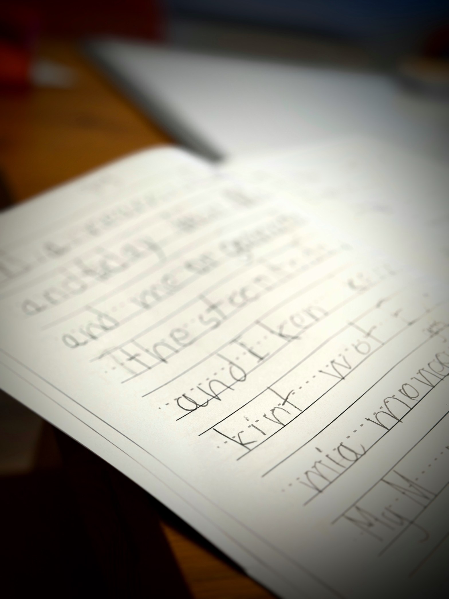 When she brought me her notebook, pride shining, I knew we were back on track. The letters were slower, deliberate. A full page—thirty or so words—evidence of time taken. And her reading it aloud to me was the cherry on top. She’d taken it from beginning to end and made it her own.