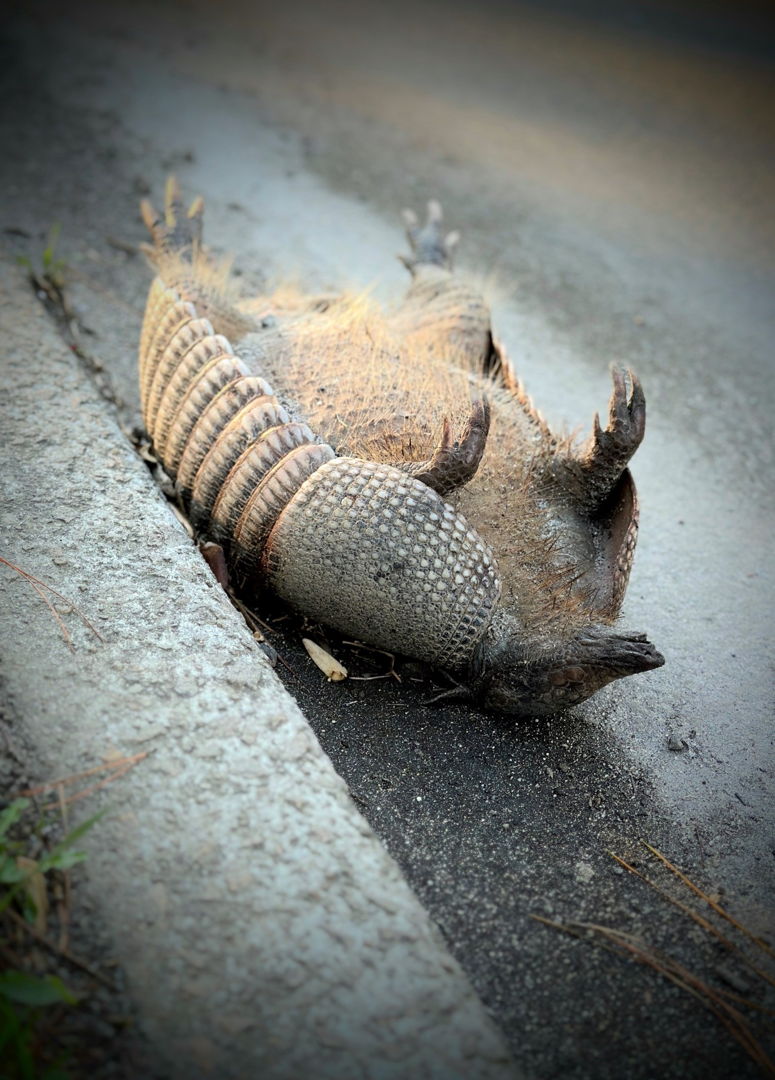 I got to see an upturned armadillo — deader than dead on the side of the road. I stopped and took its photo. An odd thing to want. But I felt grateful for the up-close shot. I’ve passed several before while driving, but the pace and business of life never allowed the pause.