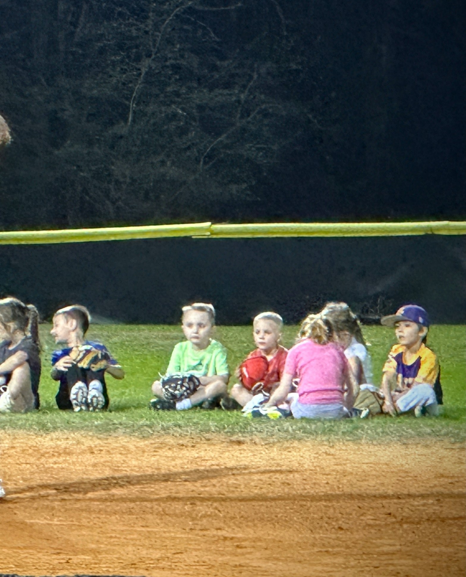 Our oddities crop up in weird ways. At T-ball, once each kid took their turn fielding three balls and throwing them to first, they sat down cross-legged in the outfield. One after the other sat behind the next. A line of ten formed, all facing the infield.