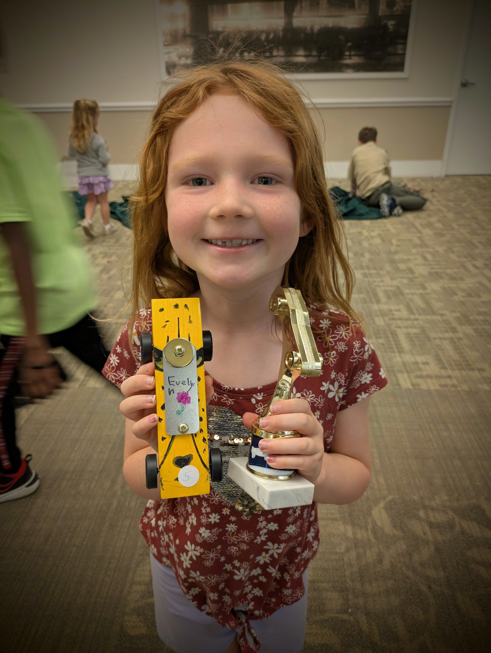 Evelyn participated in the Pinewood Derby—her first-ever Scouts activity. It’s the longest-running and most iconic Scout event, starting back in 1953. Her third-place finish for speed earned her a sleek car trophy (“It’s hollow inside,” she reported after an eyeball inspection), along with a participant badge and ribbon.
