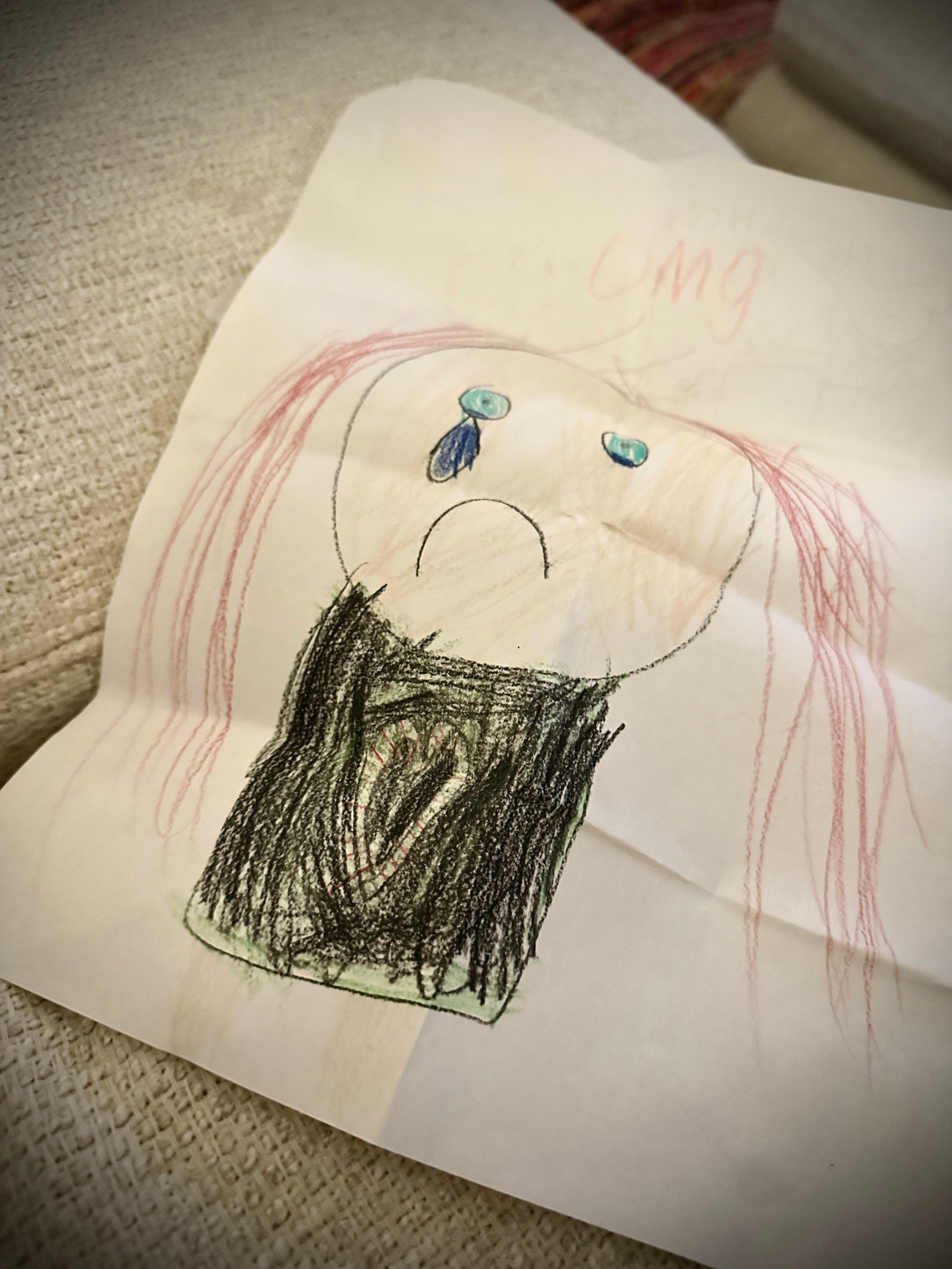 Accept that this sweet, freckled-nose, princess-of-play is expanding into more of herself. It’s terrifying. And I want this folded-up paper—the tear-streaked face—to go back in the box. I’m not ready.