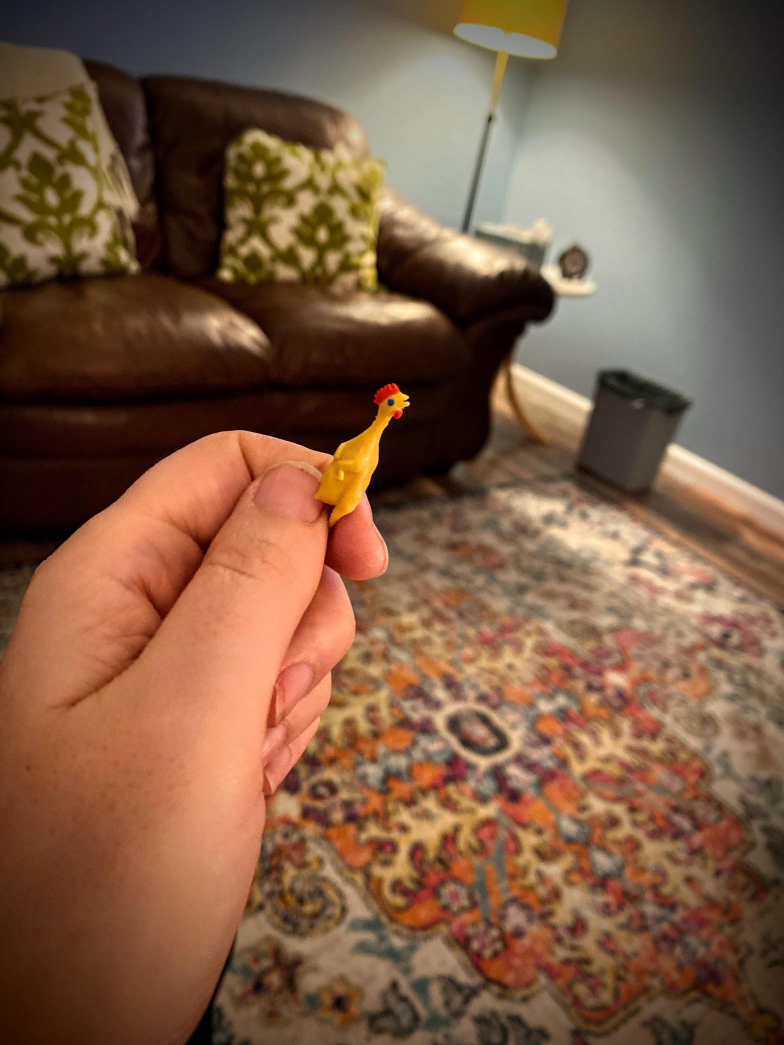 Eyes sunk deep in their sockets, I trudge myself to work. Last night’s D&D session 11 pm, followed by writing and yoga, led to a late night for this sweet body of mine. I felt it, too, like a hangover. Still, when arriving at my office, snaking through its corners, and flipping on lights, IContinue reading “The Tale of The Teeniest Rubber Chicken”